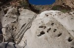 and by the many pueblo dwellings evident in the caves walls. There were several cliff caves that could be accessed by short ladders so of course I just had to climb them. I relate it to the Kevin Costner movie “Field of Dreams” – it they build it then climb it… 🙂 I had seen the ladders pictured in all the brochures for the park and stupidly thought that I had just climbed the big one. Dumb, dumb me… the big climb was a side trail known as Trail to Alcot House. Vertical climb of 140 feet up the cave wall by way of a series of 4 ladders – wooden handmade ladders bolted to cave wall. When I arrived at the cliff wall there were several hikers already climbing up. I had to wait my turn. I was a little nervous…. Finally it was my turn with no one waiting behind me. I started up the first ladder and it was ok then I got to the second ladder which was a little taller.