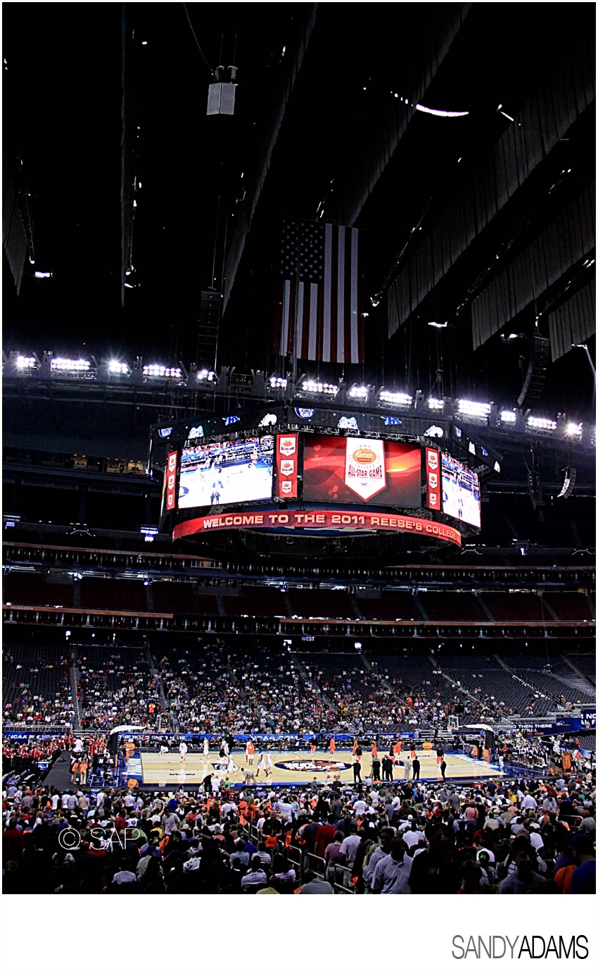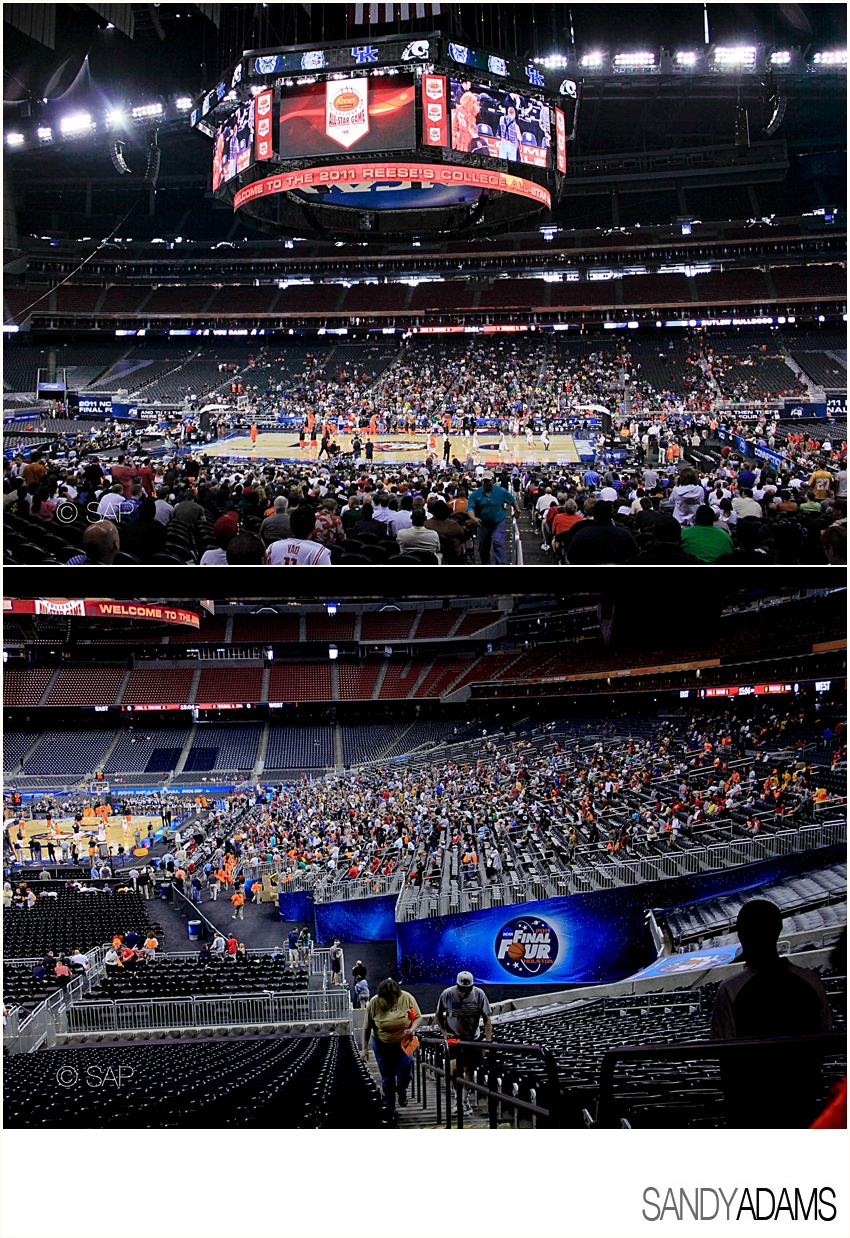 There were not nearly as many fans there as I thought, but I did run into a family that had been to 12 NCAA Final Fours with Houston being their 13th. They even came in matching t-shirts made especially for their trip listing each final four they had been too. Now that is dedication! I also got a peek at the Reese’s College All-Star game. While my boys in blue (Memphis) were kicked out of the tourney early, I held true to my Memphis heritage and left the practice session when the Kentucky team came out… (die-hard basketball fans will SO understand!)