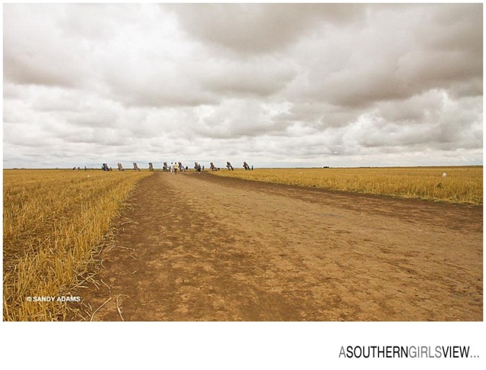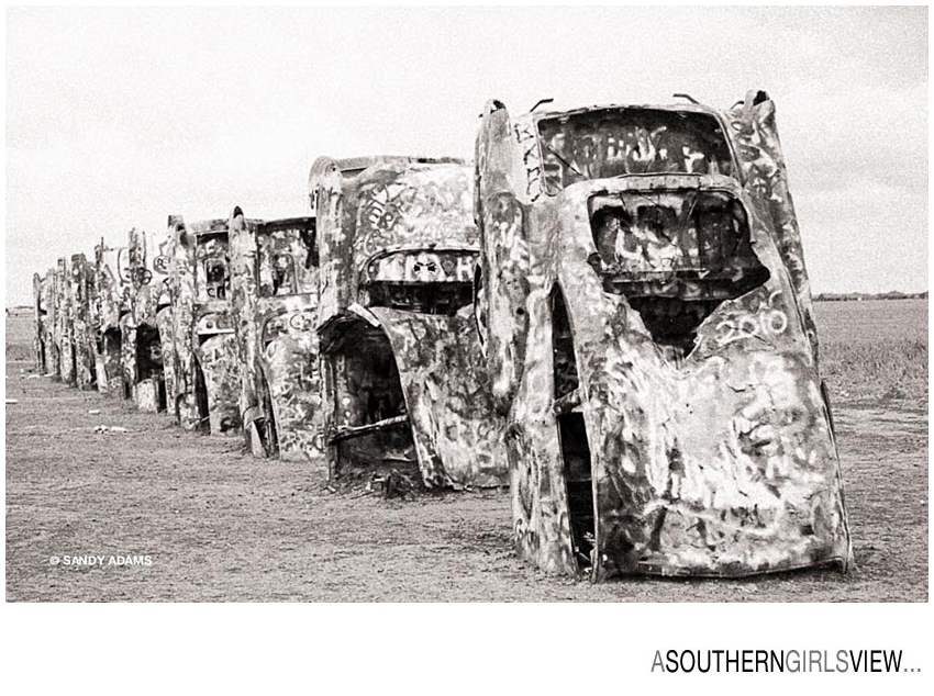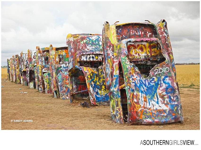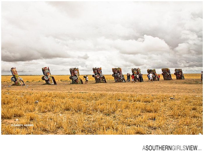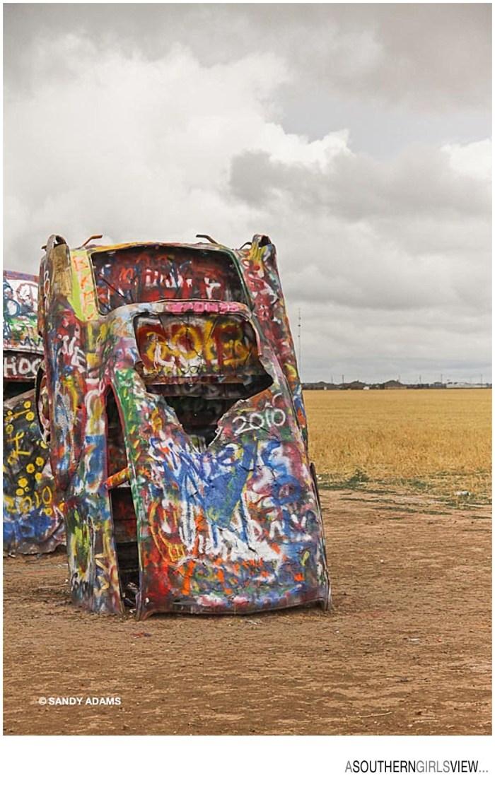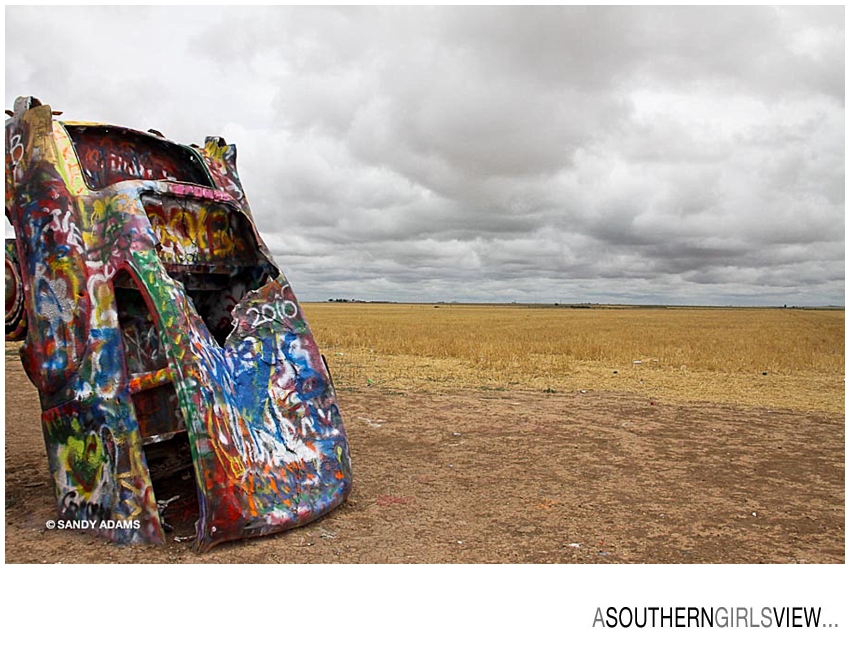 Continuing my coverage of historic Route 66, this spotlight is on a star Texas site… the famous Cadillac Ranch. Once you pass thru Amarillo heading west long I-40, the “ranch” can be located easily just a few minutes outside of Amarillo. I toured the “ranch” on a very hot, humid July day. Swirling black clouds could be seen in the big Texas sky and gusts of wind were kicking up constantly with a little dust mixed in.